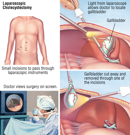 使用通过其他小切口放置的小器械,外科医生能够从胆囊中除去液体和结石以使其收缩。 然后可以将胆囊移出并通过相同的小孔中的一个拉出。 由于手术伤口很小,人们很快从腹腔镜手术中恢复过来。